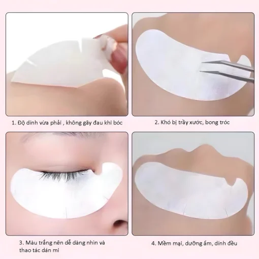 Thiết kế dáng cong vừa vặn với đường viền mắt, giúp bảo vệ toàn diện vùng mi dưới khỏi keo dính hay tổn thương trong lúc làm việc. Một túi gồm 100 miếng dán (50 cặp), được đóng gói gọn gàng, dễ bảo quản và sử dụng lâu dài, đặc biệt tiết kiệm chi phí cho spa, salon hoặc cá nhân làm dịch vụ tại nhà.